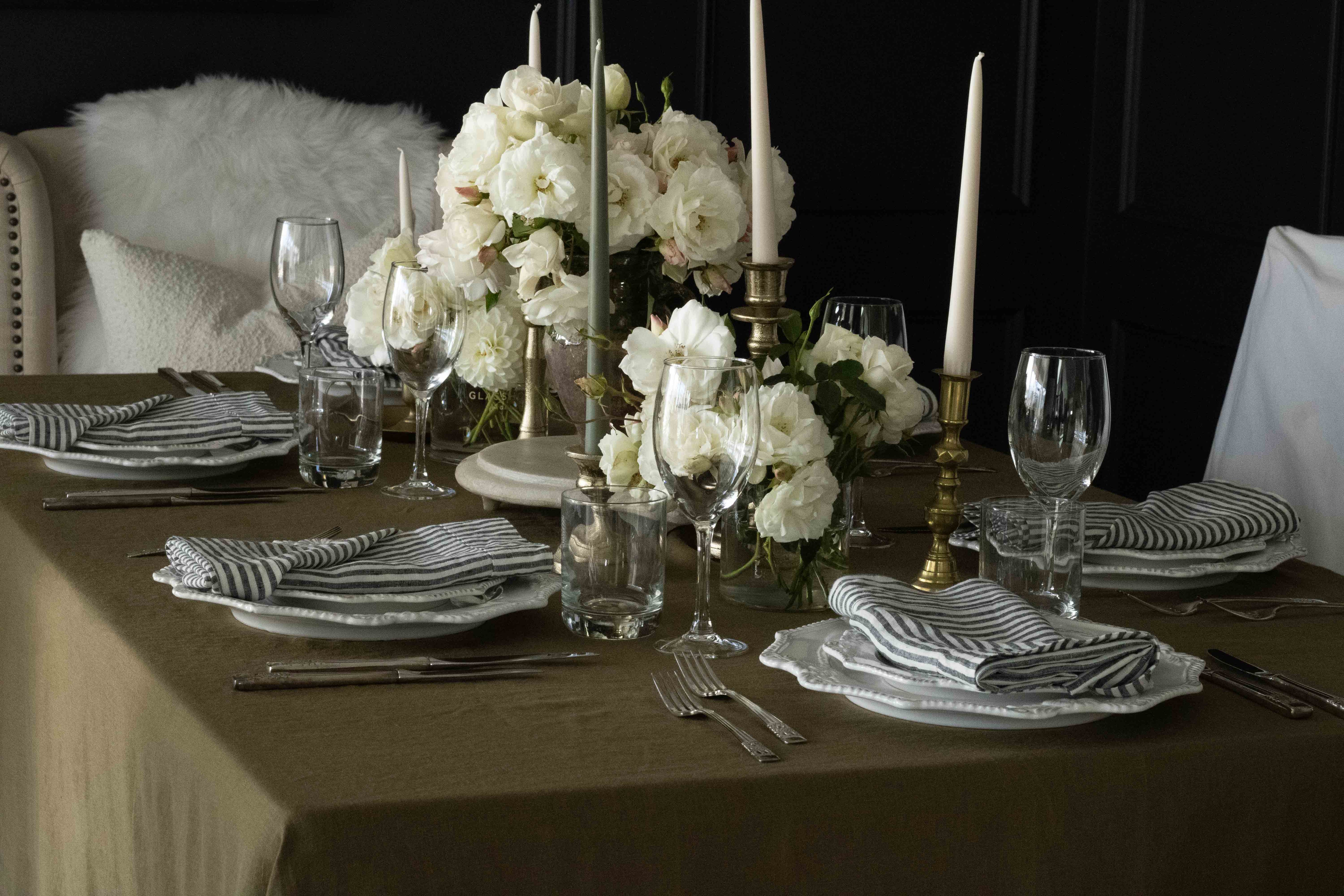 Or style your table 'French Country' with our Bircher nautural coloured linen tablecloth paired wout our Caper-Berry Green napkins.